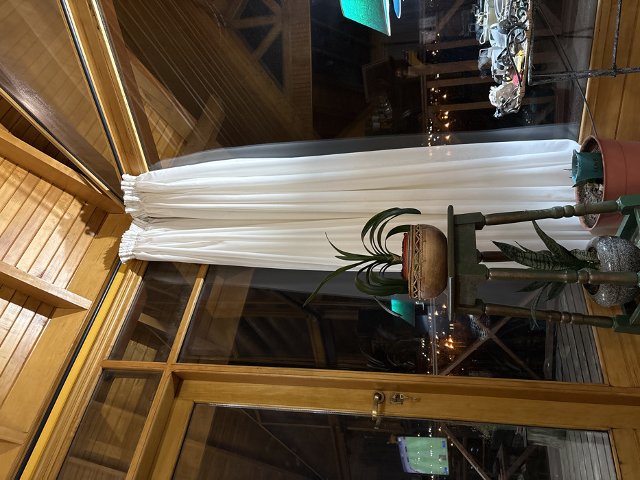 A room with wood paneled walls and a triangular wooden ceiling. Curtains hang in front of a large window, reflecting interior lights. A small dark-green colored plant stand holds three potted plants in different colors. One pot is a tan color with a red patterned rim, another is orange, and the third is dark gray. The window shows a reflection of the room interior.