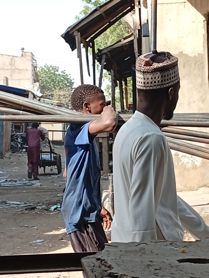 The image depicts an outdoor scene in Kofar Ruwa, Nigeria, under clear daylight conditions