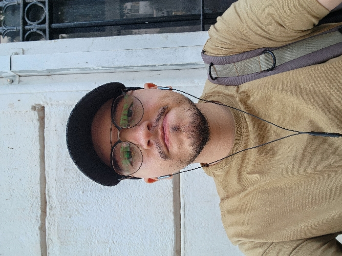 A man wearing a black cap, black-framed glasses, a brown t-shirt, and a brown backpack is standing against a white wall. He has a goatee and is looking at the camera. The image is taken in Alger Centre, Algeria, near the coordinates (latitude: 36.769, longitude: 3.055). He is wearing black earphones in his ears. His right shoulder and arm are not visible, indicating that the picture is likely a selfie. The wall appears to be part of a building or a structure. A part of a metallic railing, seemingly part of a gate or fence, is visible in the right part of the picture. The man is positioned near the wall, his body is facing slightly toward the camera, and his head is slightly tilted upwards. The lighting is bright, suggesting the possibility of an outdoor setting. The man's expression is neutral.