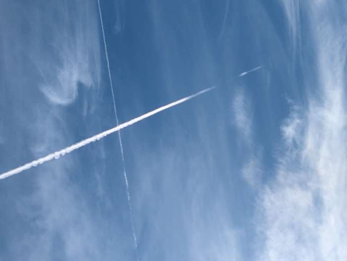 - "A bright blue sky with wispy cirrus clouds is bisected by two contrails" by FM-069u42, licensed under CC BY 4.0