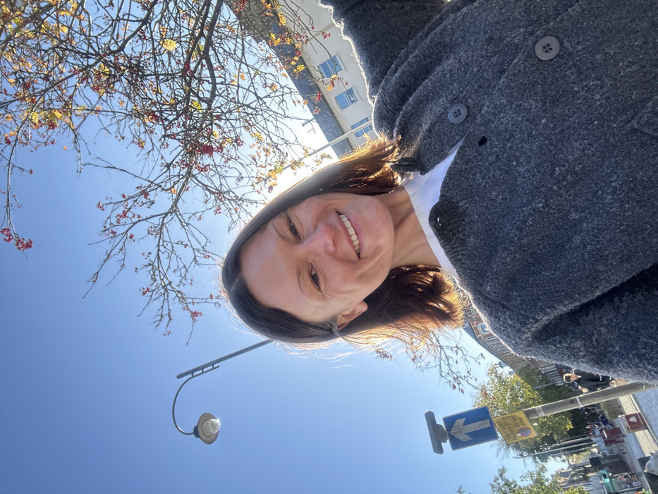 A low-angle selfie captures a woman smiling outdoors on a clear, sunny day in Tunbridge Wells, United Kingdom