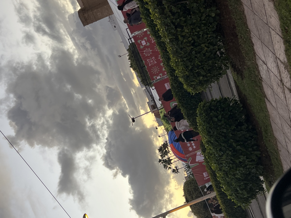 An outdoor scene shows a line of bushes bordering a tiled sidewalk. Behind the bushes are several people and red banners with white symbols. A partially visible blue and red inflatable structure is also present. The sky is filled with dramatic, dark clouds, with a hint of golden light peeking through. A street lamp is visible at the bottom of the frame, and a portion of a car is seen in the lower right corner.