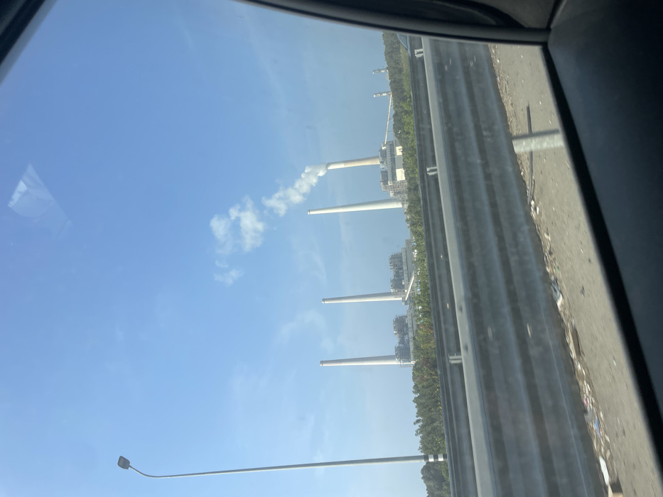 The image depicts an exterior view, likely captured from the interior of a moving vehicle, showcasing the Orot Rabin Power Plant (Rutenberg Power Plant) situated on the Mediterranean coast in Hadera, Israel. In the mid-ground, the large industrial complex of the power plant is visible, characterized by multiple substantial white concrete cooling towers/smokestacks. Four primary, very tall, slender smokestacks are prominent, with two of these on the right actively emitting thick, white plumes of smoke or steam into a clear, bright blue sky. Associated gray industrial buildings are clustered at the base of these structures, with additional smaller industrial elements extending to the right. A dense line of green vegetation (trees and bushes) partially obscures the lower parts of the plant, separating it from the foreground. The foreground features a multi-tiered metal guardrail running horizontally across the lower third of the image, indicating proximity to a highway or major road. Below the guardrail, the ground is a mix of dirt and scattered litter/debris. To the far left, a tall, slender street light pole with a dark, rectangular fixture extends upwards. The far right side of the image reveals the interior edge of a car door frame, and reflections are visible on the vehicle's window, through which the scene is observed. The sky is predominantly clear blue with minimal cloud cover, suggesting daytime conditions. No individuals are visible in the scene.