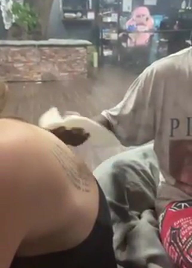 - "A tattoo artist is shown wiping the back of a blonde, fair-skinned person wearing a black tank top and black shorts" by FM-wUaYc2, licensed under CC BY 4.0