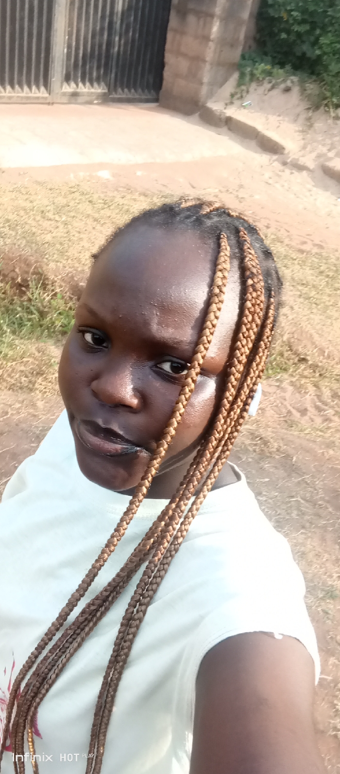 A young woman with dark skin and brown braided hair looks directly at the camera. She wears a white t-shirt. The background includes a metal gate, a grassy area, and sandy ground. The lighting suggests it is daytime. The subject's skin appears slightly shiny. The image appears to be a selfie taken outdoors.