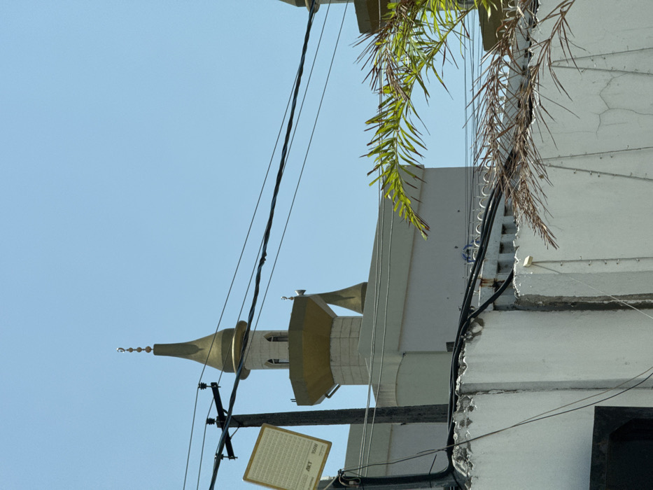 The scene depicts an outdoor urban environment in Ilado, Nigeria, under a clear, bright blue sky. A mosque is the primary architectural subject. Its main minaret is a light-colored, multi-tiered structure culminating in a golden, tapered spire adorned with multiple spherical finials and a crescent moon. Below the spire, an octagonal section features small arched windows and a mounted speaker. A second, smaller golden spire is partially visible behind the main minaret. The mosque's main building, appearing light-colored, is visible beneath these structures. In the left foreground, a dark utility pole supports several black electrical wires stretching across the mid-ground. A rectangular, light-colored panel, partially labeled "AKT 150W," is affixed to this pole. A concrete perimeter wall with an uneven top edge traverses the lower foreground, with multiple dark cables draped over it. Green and dried palm fronds enter the frame from the right, partially obscuring the wall and lower mid-ground. No individuals are present.