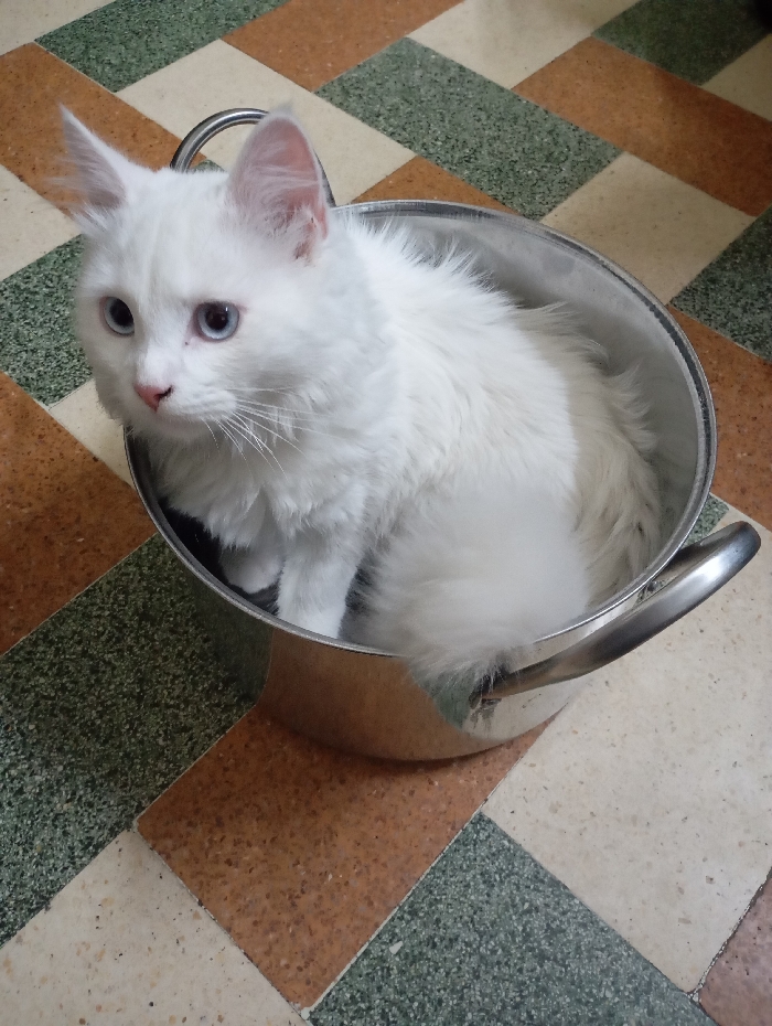 - "A single long-haired white feline subject with light blue irises is observed seated within a polished metallic cooking pot" by FM-uNgLB2, licensed under CC BY 4.0