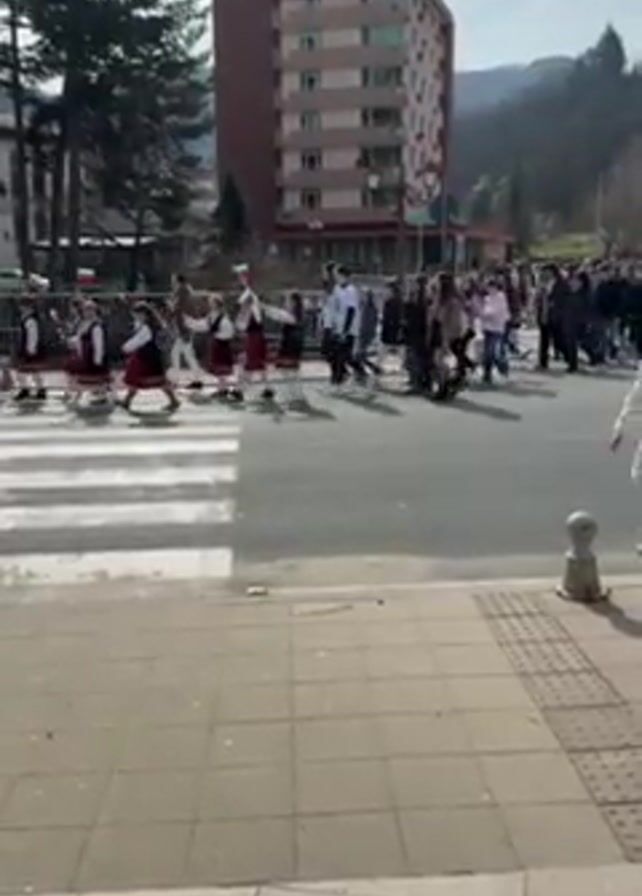 A video captures a street scene during the day, with a crowd of people using a crosswalk. A group of individuals in traditional Bulgarian folk costumes, some holding flags, stand out among the crowd. They are crossing the street in the same direction as the others. The setting appears to be an urban environment with a building labeled "HOTEL" in the background. The sky is bright, suggesting clear weather. The camera seems to be stationary, capturing the pedestrian activity from a slightly elevated position on the sidewalk.
