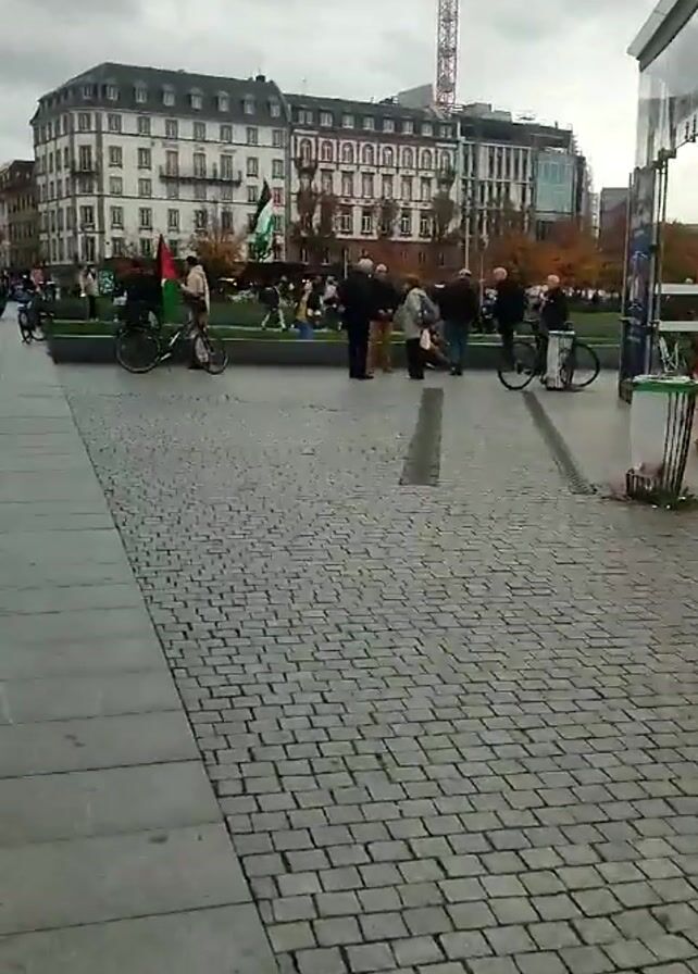 The video depicts an outdoor scene on what appears to be a cloudy day. A group of people are gathered in a plaza or public area, some holding Palestinian flags. The plaza is paved with gray cobblestones, and there is a modern building with numerous windows in the background. A red construction crane is visible behind the building. Some individuals are standing, while others are on bicycles. There are also trees and landscaping elements visible in the background. A trash bin is situated near the edge of the plaza, and part of a glass structure is visible on the right side of the frame.