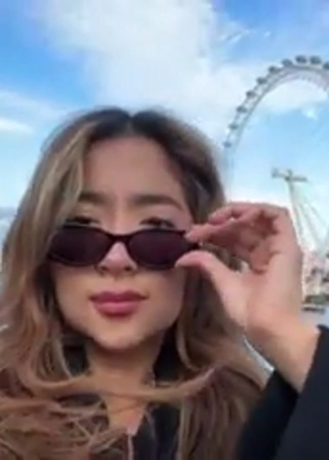 A young woman with long wavy hair is taking a selfie. She is wearing sunglasses and a dark jacket. Behind her is the London Eye Ferris wheel, the River Thames, and some buildings. The sky is partly cloudy. She slightly adjusts her sunglasses and smiles at the camera.