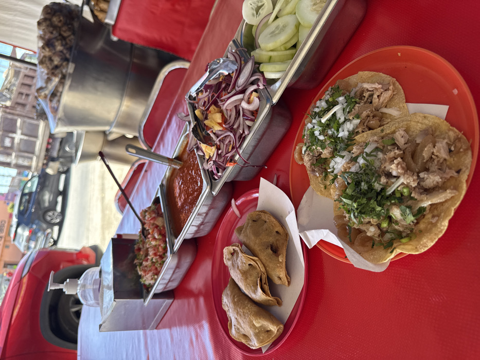This image depicts a street food stall setup in Puebla City, Mexico, under bright daylight