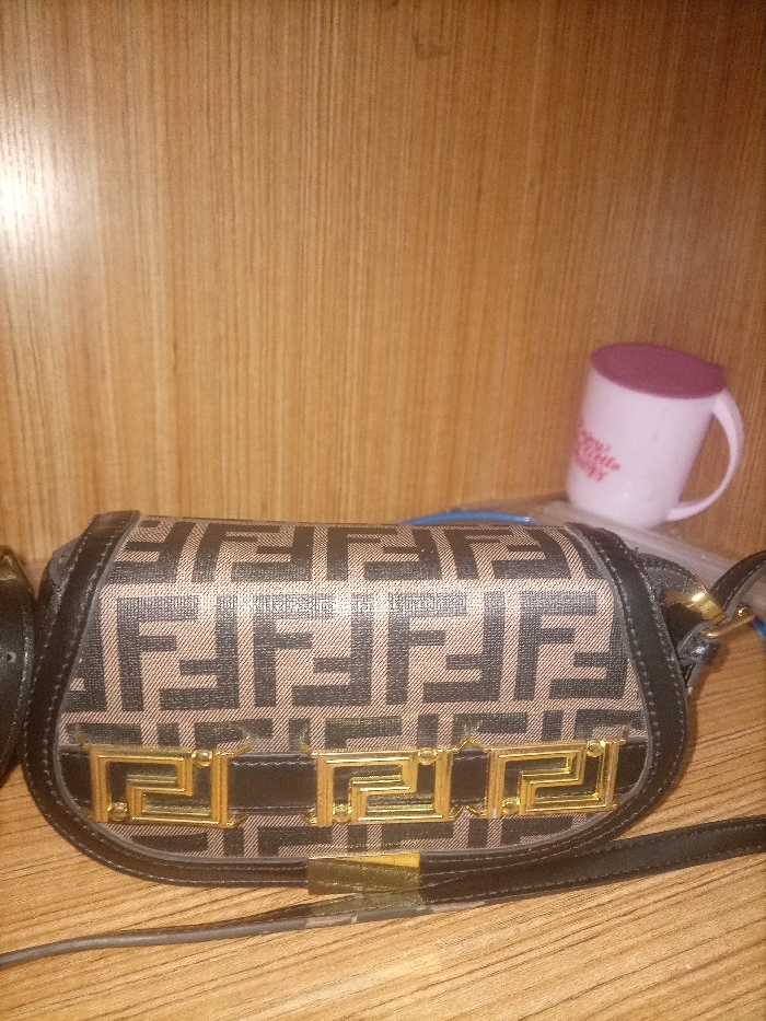A Fendi handbag with a saddle shape and a black leather strap rests on a wooden surface. The purse features the iconic brown and black Fendi 'FF' logo pattern, accentuated by a golden metal clasp and logo hardware on the front flap. A light pink mug sits on the wooden surface behind the purse, alongside transparent plastic packaging. The backdrop appears to be a light wood paneling.