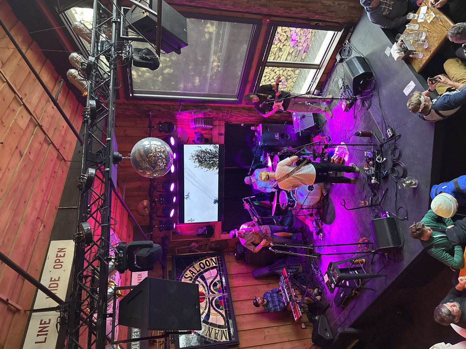 A band performs on a stage bathed in purple light. A drummer, guitarist, keyboardist, and other musicians are visible, surrounded by microphones and equipment. Above, a disco ball hangs near a stage light tower. A large TV screen displays a wintry outdoor scene. Patrons observe the show from the sides of the stage. Signs and decorative elements, like a stained-glass saloon sign, adorn the rustic wooden walls.
