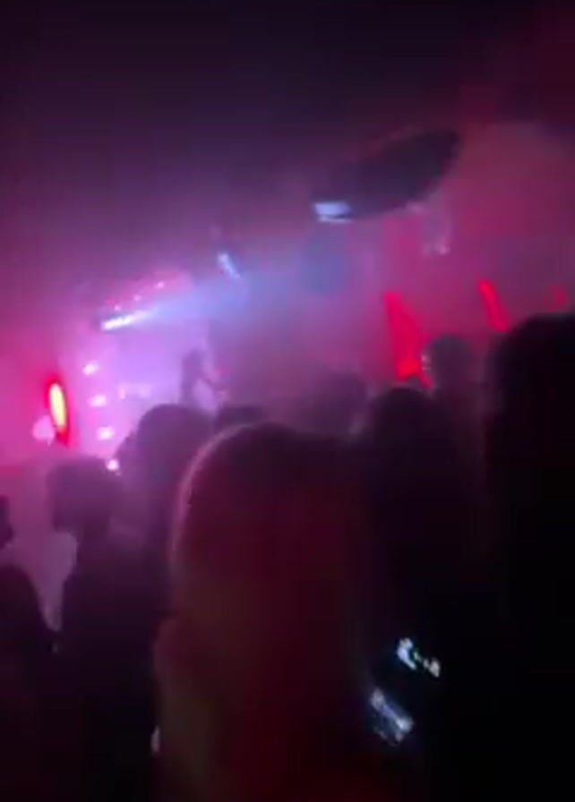 The video depicts a dimly lit, crowded nightclub with red and purple stage lighting