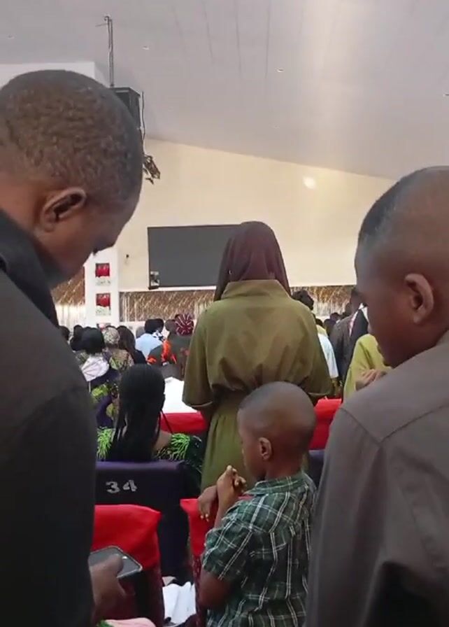 n indoor scene with a crowd of people seated in rows, likely in a church or auditorium setting. The view is primarily from the back, focusing on a small child wearing a plaid shirt standing in front of a woman with a head covering. Two men flank the child and woman, partially obstructing the view of the larger group. The man on the left is looking at his phone. There's a screen visible in the background. The overall lighting is bright. A speaker appears to be mounted above and to the left. The seats are various colors including red and purple. Some have numbers on them. There appears to be an air conditioning vent overhead. There is a visible speaker-like system on the left.