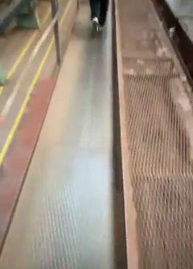 person walking on a metal walkway inside a large industrial building. The walkway has a yellow safety line and a metal mesh border. The person is wearing dark clothing, light-colored pants, and white-soled shoes, with a black backpack. The building has a high ceiling with skylights, and visible support beams and pipes run along the ceiling. The walls are a muted green, and the floors below the walkway appear to be metal. The video is shot from a first-person perspective, following the person as they move along the walkway.