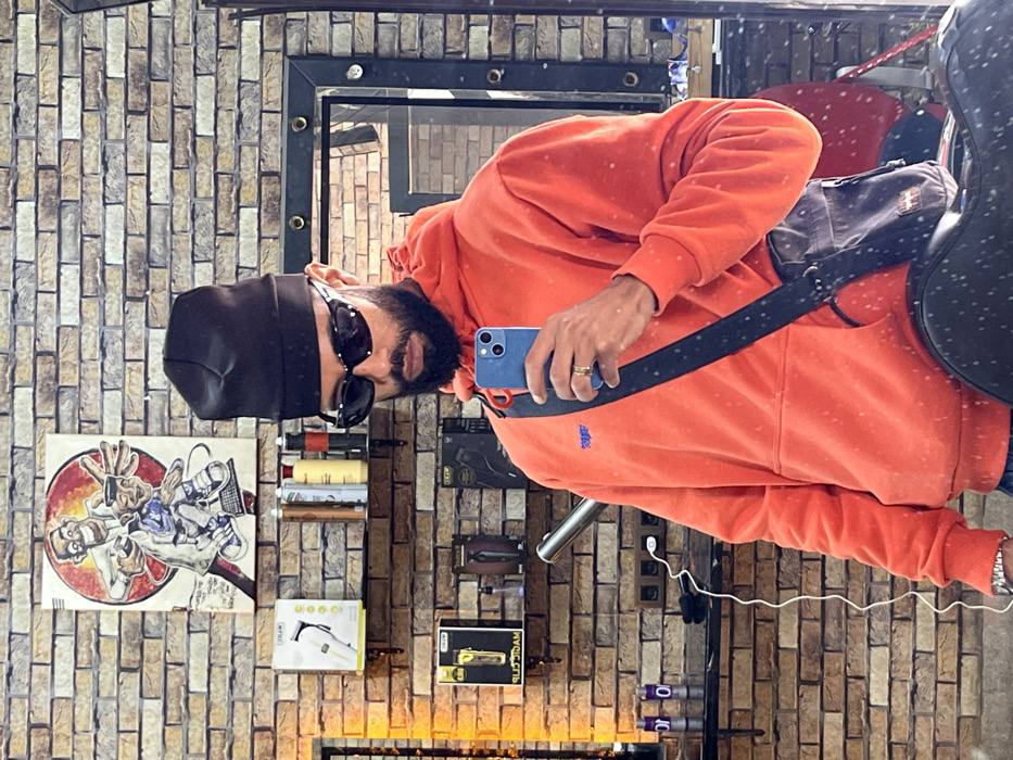 The image displays a selfie reflection of a male individual within a barbershop or salon located in Meknes, Morocco. The man, possessing dark skin, a dark beard, and dark eyebrows, is depicted from the mid-chest up. He wears dark sunglasses, a black beanie, and an orange hooded sweatshirt featuring a blue logo on the left chest. A dark cross-body bag with a wide strap is slung over his shoulder, and a blue smartphone, used for taking the photo, is held in his right hand. A gold-colored ring adorns his right ring finger, and a metallic watch is on his left wrist. A dark, speckled, possibly hard-shell case is partially visible at the bottom right. The background, reflected in the mirror, reveals a brick-patterned wall. On this wall, a framed cartoon artwork depicting two stylized figures hangs above shelves stocked with various hair care products and professional grooming tools, including boxes labeled "WAHL" and "WAHL MAGIC CLIP." Two purple bottles marked "O" rest on a counter to the left. A large, black-framed mirror, likely a salon mirror, is visible to the right, reflecting an outdoor scene with buildings and natural light. A metallic bar diagonally traverses the mid-ground.