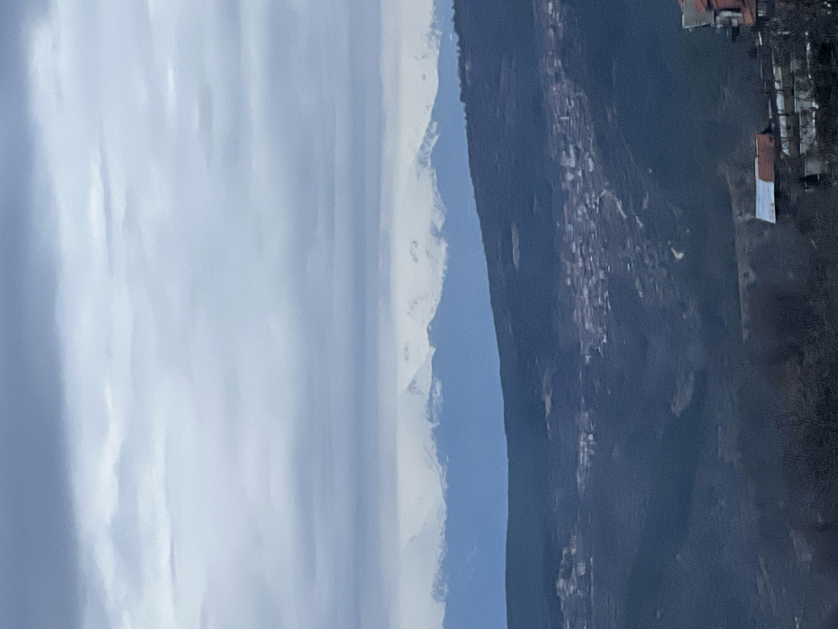 The image depicts a panoramic view of the settlement of Kribul, Bulgaria, situated within a mountainous landscape under an overcast sky. In the distant background, a prominent range of snow-capped mountains stretches horizontally across the frame. Below these snow-covered peaks, a layer of darker, blue-hued mountains is visible. The midground features a large, dark-forested mountain slope descending towards the viewer, predominantly covered in dark green or brown vegetation. Nestled within this midground valley or on the slopes is the village of Kribul, characterized by a dense cluster of numerous buildings with visible roofs, appearing in shades of red-brown and dark grey, indicating a concentrated residential area. A winding road or path is discernible through the village, connecting various sections. In the immediate foreground, to the bottom right, a portion of a building's roof is visible, featuring a distinct section of orange-brown tiles adjacent to a lighter, possibly white or galvanized metal, roofing material. Below this roof, elements of other structures or terraced land are partially seen. The sky above is entirely covered by a thick layer of grey, diffused clouds, resulting in soft, even lighting across the scene. No individuals or specific actions are discernible within the frame.
