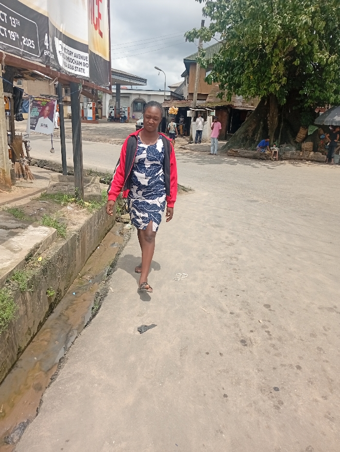This image depicts a daytime street scene at a junction in Umuode, Abia State, Nigeria, along Umuocham Road. In the foreground, a young Black female, appearing to be in her twenties, walks towards the viewer on the right side of a paved street. She wears a navy and white patterned knee-length dress, a red and black zippered jacket, and brown open-toed sandals. Her expression is neutral, and she casts a shadow to her left. Adjacent to her left is a concrete sidewalk curb bordering a drainage ditch containing stagnant, murky water and some debris. The grey paved street surface shows signs of wear and discolored patches. The midground and background reveal a commercial environment. To the left, a large billboard structure displays "OCT 13TH - OCT 19TH, 2025," a partial "SERVICE" sign, and another sign reading "VICTORY AVENUE, UMUOCHAM RD, ABIA STATE." A political campaign poster featuring a male figure is also affixed to a pole. In the center-background, a petrol station with a white canopy and fuel pumps is visible. To the right, numerous small market stalls with corrugated metal roofs line the street under the shade of a large, mature tree with dense green foliage. Several individuals are present, including one person carrying a large cluster of yellow fruit on their head and another wearing a pink shirt near a stall. Mixed architectural style buildings, including a two-story brown structure, are visible beyond the stalls. The sky is partly cloudy.