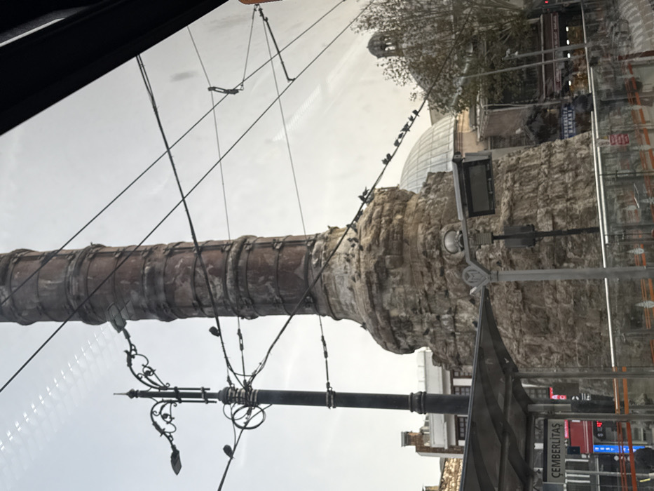 A tall, ancient column with weathered, ringed sections stands prominently. Its base is broad and rough, blending into a domed structure behind it. Wires crisscross the sky above, and a vintage street lamp adorns the scene. Below, building facades, signage, and bus stop elements suggest an urban setting. The view appears to be captured from inside a vehicle. Birds are perched along the column and wires.