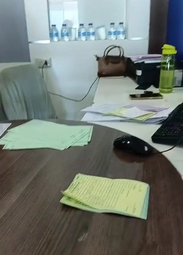 The camera pans upward in an office setting. The foreground is a brown wooden table with stacks of green and yellow papers, a black computer mouse. Behind it is a white desk cluttered with papers, a computer keyboard, water bottle, and mug. Bottles of water are displayed on a glass shelf on the wall. The camera moves up to show a round logo on the wall that reads "Mount Fuji Mineral Water." There is a printer next to a blue chair.