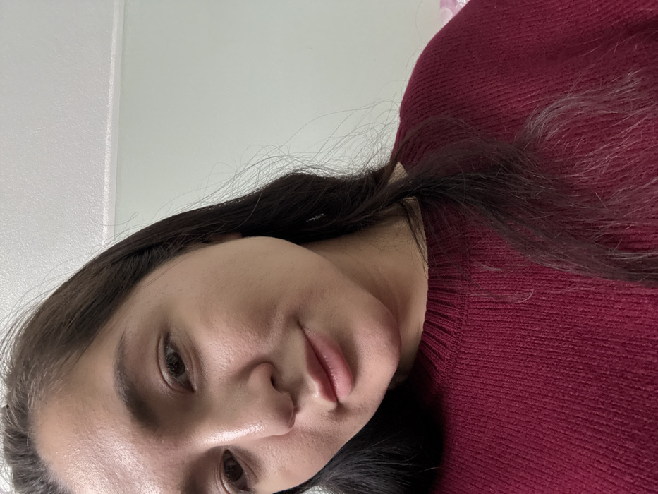 A close-up, slightly angled portrait depicts an adult female positioned indoors in the city of Yegoryevsk, Russia. The subject, with dark hair and a fair complexion exhibiting a slight sheen on the forehead and nose, is shown from the chest up, wearing a dark red, ribbed-knit, crew-neck sweater. Her lips are naturally closed, and her dark eyes are directed towards the camera. The background consists of a plain, light-colored wall, likely pale green, with a white ceiling or upper wall trim visible in the top right portion of the frame.