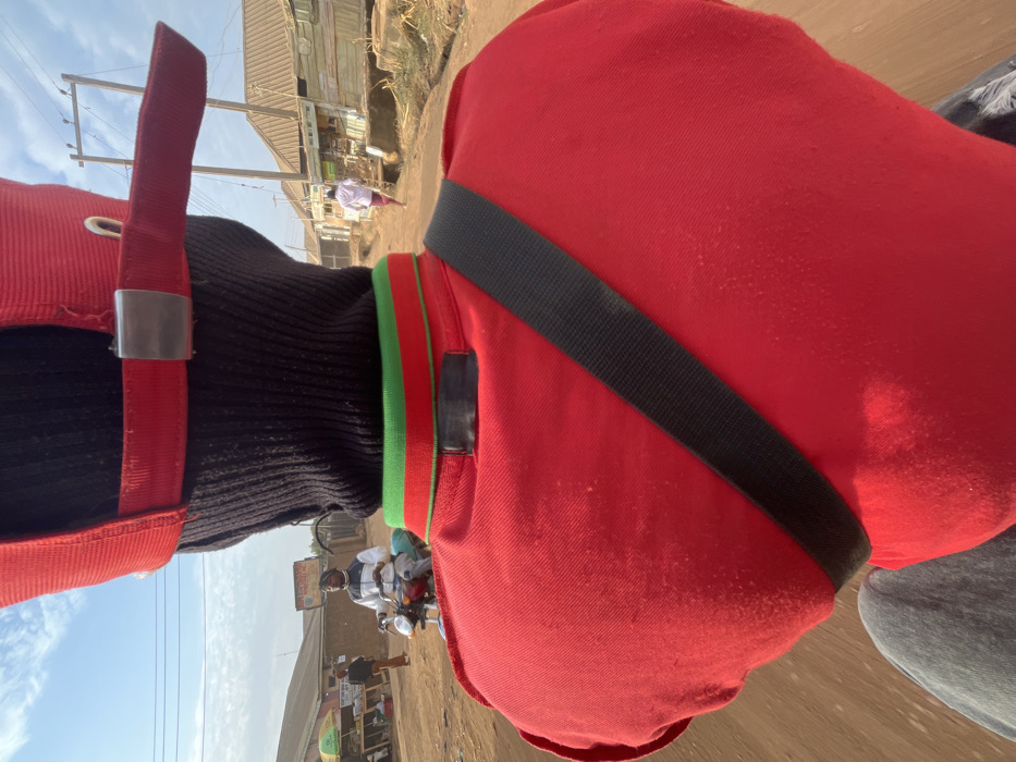 - "A close-up, angled shot shows a person wearing a red baseball cap, a black ribbed top, and a red shirt with a black strap across the chest" by FM-Etqhn1, licensed under CC BY 4.0
