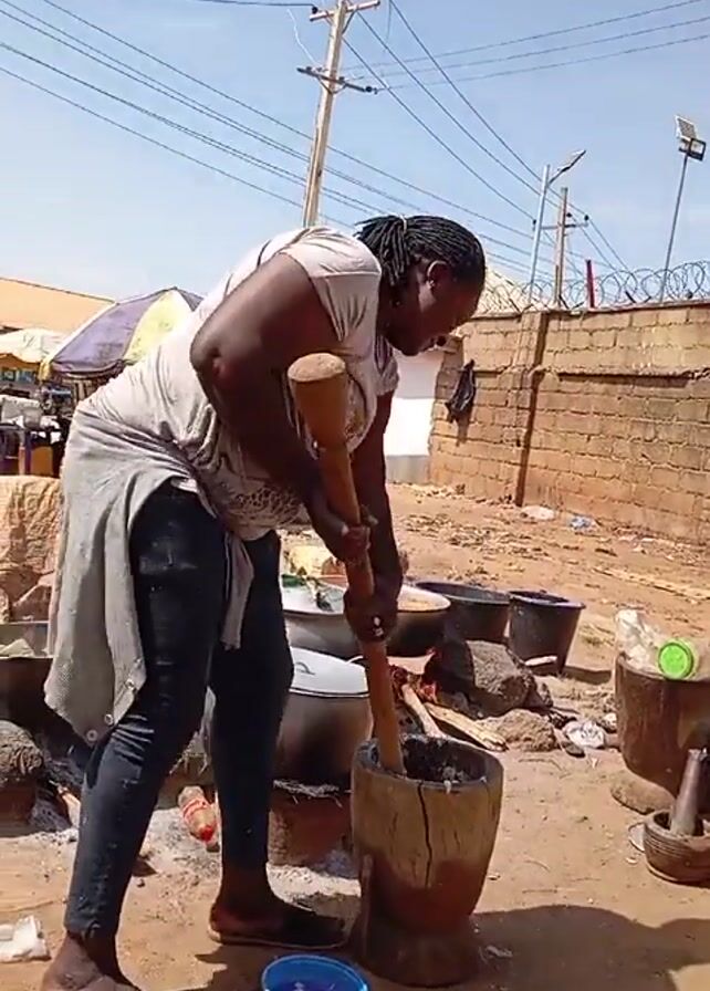 woman in a casual outfit pounding something in a large wooden mortar with a long wooden pestle. She's standing outside in what appears to be a cooking area, with multiple large pots and containers nearby. A small fire burns under one of the pots. There's a brick wall in the background, and the sky is clear and blue. The woman is the only person clearly visible in the video.