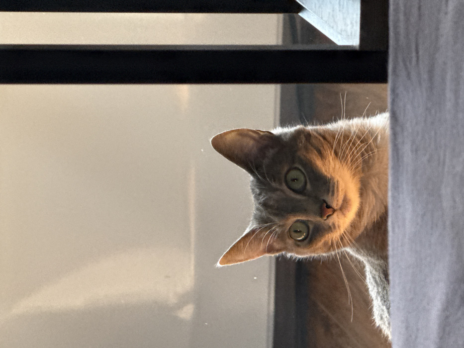 - "A light gray tabby domestic short-haired cat is captured in a medium close-up, positioned with its head and upper chest visible above a light gray, textured surface in the foreground" by FM-HdjVs2, licensed under CC BY 4.0