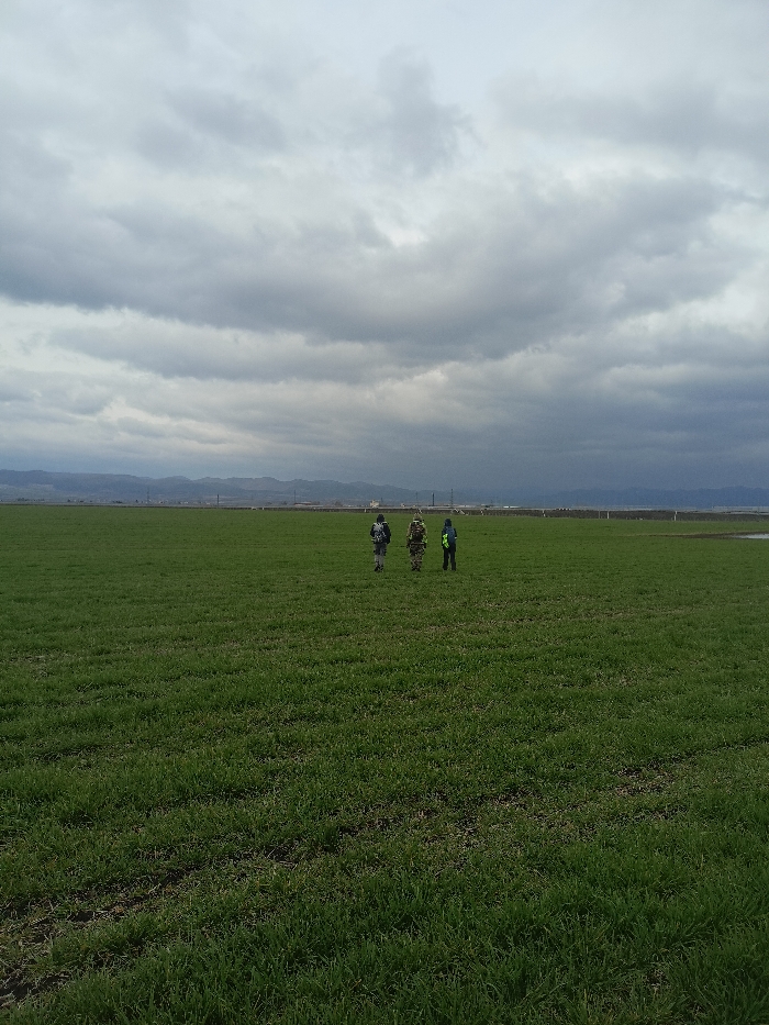 The image depicts three individuals traversing an expansive, green agricultural field under an overcast sky in Mramor, Bulgaria