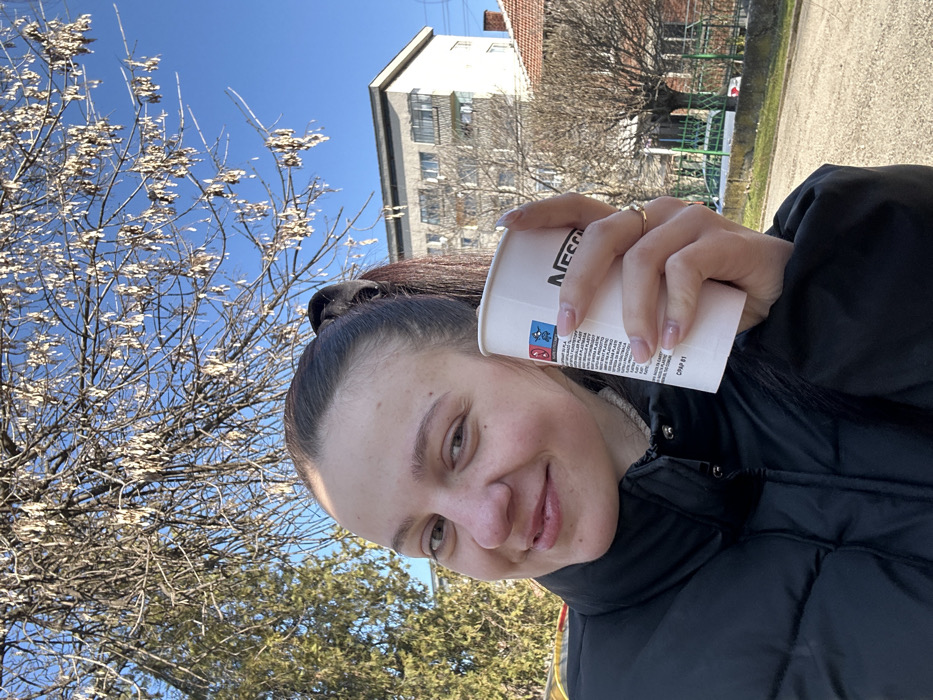 An outdoor eye-level portrait shot in Cherven Bryag, Bulgaria, features a light-skinned female subject with dark hair pulled back in a ponytail, looking directly at the camera with a slight smile. She wears a black puffer jacket with a high collar. Her right hand, adorned with a thin gold ring on the ring finger and light pink manicured nails, holds a white disposable cup bearing the "NESCAFÉ" logo and other printed text and symbols, including recycling indicators, partially obscuring the lower right portion of her face. The background consists of a clear blue sky. A large deciduous tree with bare branches and numerous light brown seed pods occupies the upper-midground. A green coniferous tree is visible on the far left. To the right, a multi-story, light-colored apartment building with visible windows and balconies stands in the mid-distance. A smaller building with a brown-tiled roof is situated to its right. A green metal fence or railing and a paved surface are visible in the lower right background.
