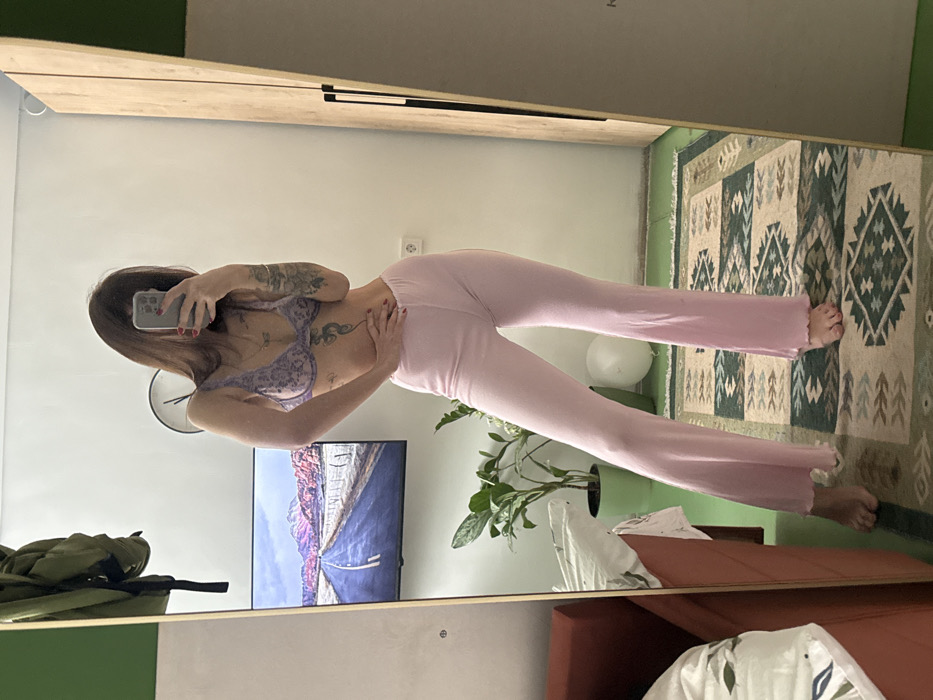 The image displays a mirror selfie of a female individual within an interior setting. The subject is slender, with long dark hair, and is wearing a light purple lace bra and light pink flared pants with ruffled hems. Her right hand, with red nail polish, holds a smartphone, obscuring her face, while her left hand rests on her hip. Multiple tattoos are visible on her body, including her left forearm, left rib cage, and upper chest. She is barefoot. The reflection in the full-length mirror reveals the room's environment. The walls are white. To the left of the subject's reflection, a flat-screen television is mounted on the wall, displaying an image of a road leading through snowy, pink-hued mountains. Below the TV, a potted plant with green leaves is on the floor, next to a partially deflated white balloon. A minimalist wall clock with a black frame is visible above the TV. To the right of the subject's reflection, a white electrical outlet is visible on the wall, and further right, a light wood-grained wardrobe or cabinet with dark vertical handles stands against the wall. The floor is covered by a patterned rug featuring geometric designs in muted green, brown, and off-white tones, with a narrow strip of green flooring visible at the room's edge. A reddish-brown piece of furniture, possibly a bed or sofa with a patterned cover, is partially visible in the bottom left corner of the actual image frame, outside the mirror's reflection. The specific location within the city of Chaikovsky, Russia, cannot be determined from the visual information provided in the image. The room's decor and features are generic and do not contain identifiable landmarks or unique architectural elements.