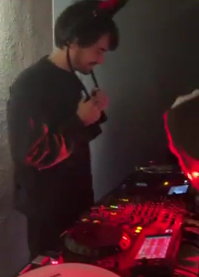 A man, who appears to be a DJ, stands at a DJ setup in what looks like a nightclub or party setting