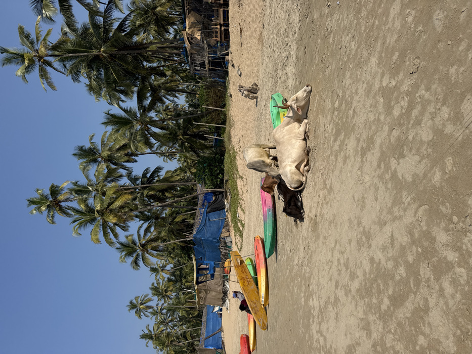 A sandy beach scene includes multiple lounging cows near colorful surfboards. Palm trees line the back of the beach, with makeshift shelters or stands constructed in the background. The sky is blue and clear.
