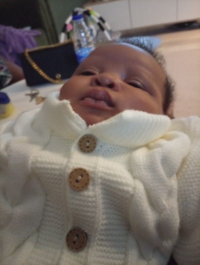 - "A baby with dark skin rests in a white, buttoned, knitted sweater" by FM-Q9TnR2, licensed under CC BY 4.0
