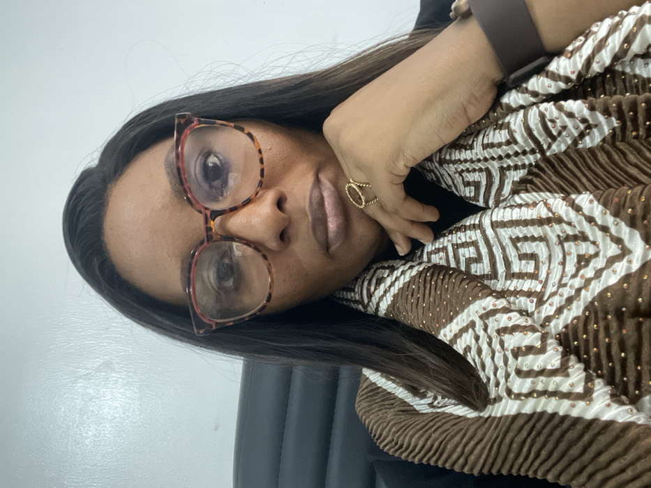 A front-facing portrait shows an adult individual, identified as female, with dark skin and long, straight, dark hair. She wears tortoiseshell-patterned eyeglasses with a red upper rim and is looking directly at the viewer with a neutral expression. Her right hand, adorned with a gold-colored open oval ring on the ring finger, rests with fingertips near her chin. A dark-colored smartwatch or fitness tracker with a brown band is partially visible on her left wrist. She is wearing a dark top, over which is draped a brown and white pleated scarf or shawl featuring a geometric pattern and scattered small, shiny embellishments. The background consists of a plain, light-colored wall with minor blemishes and a segment of a dark, padded chair visible to her left. The specific location within the city of Lokoja, Nigeria, cannot be determined from the visual evidence provided.