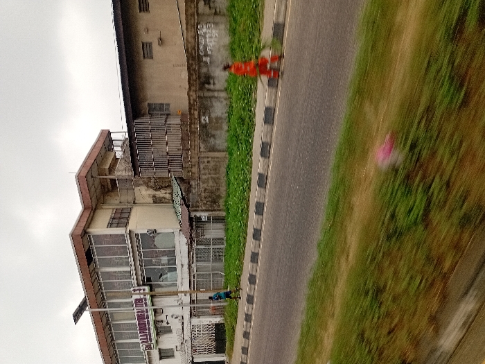 A multi-story building stands beside a road with a black-and-white striped curb. The building features glass windows and is adorned with signage. Adjacent to the road is a grassy area. A person dressed in orange attire walks along the roadside. Another individual is visible near the building. The sky overhead appears cloudy, suggesting overcast conditions.