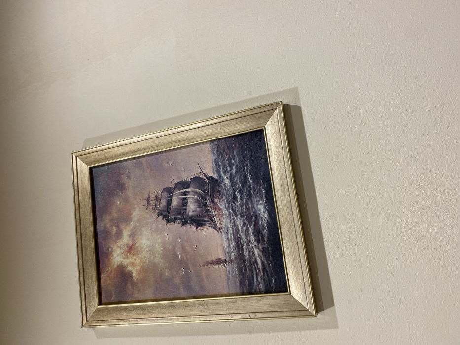 The image displays a framed painting hung on a plain, light beige wall. The frame is light gold-colored with a simple, ribbed profile. The painting depicts a turbulent maritime scene under a dramatic, cloudy sky with reddish-brown hues. A large, dark-hulled, multi-masted sailing ship with dark sails is prominent in the midground, navigating rough, dark blue-grey waves. A smaller, more distant sailing ship is visible to the left. Several white seabirds fly in the sky between the vessels. The painting is angled slightly forward from the wall, casting a shadow on its right and bottom edges. No specific environmental or architectural details are present in the image to confirm a location in the city of Vidin, Bulgaria.
