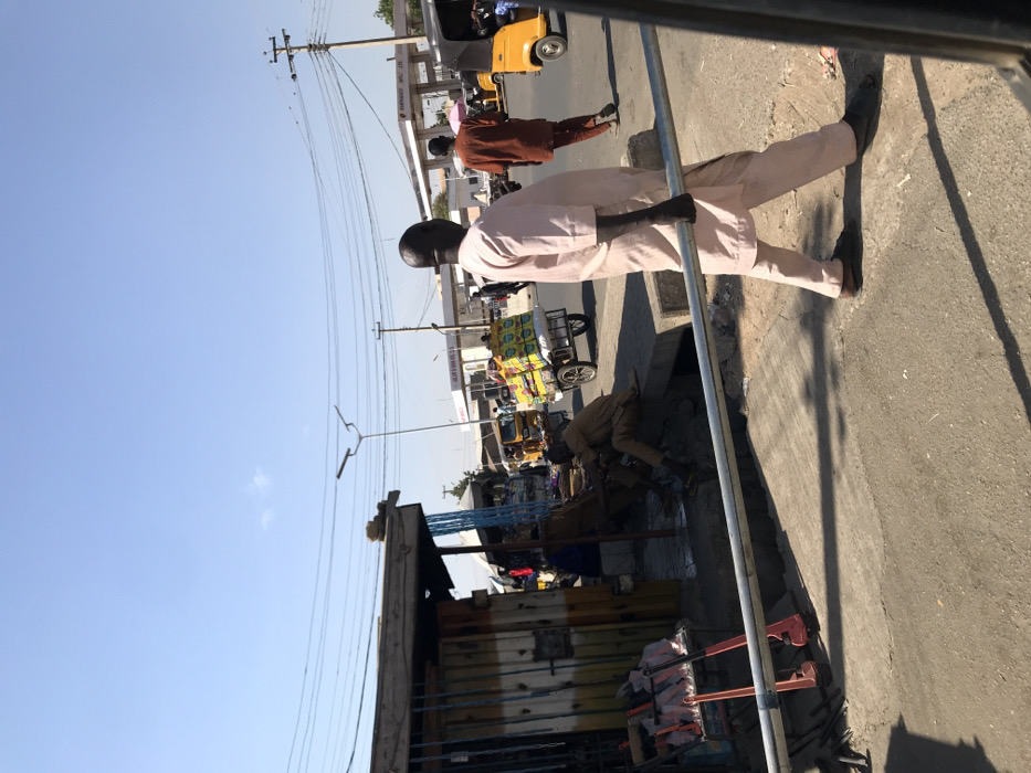 The image depicts a bustling street scene in Jimeta, Nigeria, under a clear, bright blue sky