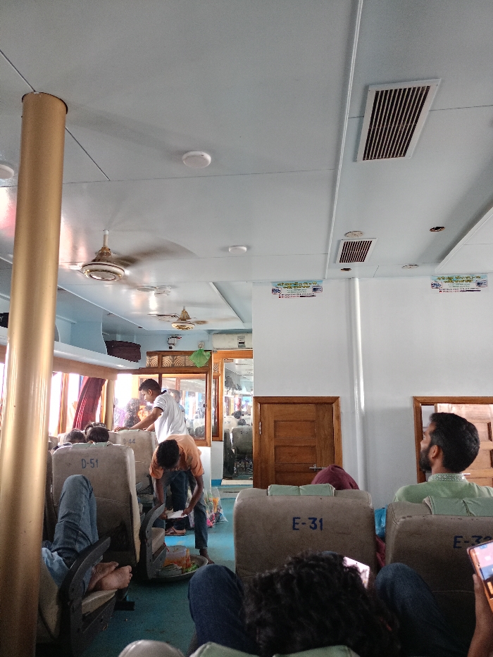 The interior of a ferry, likely in Bangladesh, judging by the Bengali writing on signs and the clothes worn by the passengers