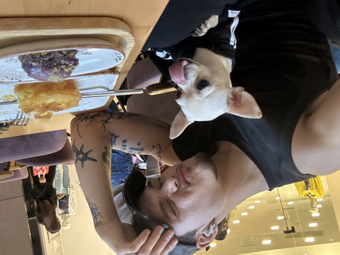 The image depicts an indoor scene within a commercial establishment, specifically a cafe or lounge, located in a shopping center in Sofia, Bulgaria. The background features a large glass partition reflecting interior lighting and displaying retail mannequins from an adjacent store; one mannequin wears a yellow jacket, and another wears a striped shirt. The word "FELIZ" is visible in reverse on the glass. In the foreground, a young adult male is seated, facing the camera, wearing a black sleeveless top and a black baseball cap worn backward. He has dark hair, a light mustache, and a short beard, with white wireless earbuds in both ears. His right arm is visibly tattooed with multiple dark designs. His facial expression displays puffed cheeks and pursed lips. On his lap rests a small, white short-haired Chihuahua, wearing a black and white striped garment, with its tongue extended and touching its nose. On the wooden table in front of them, two white ceramic plates on a light wooden tray display desserts: a partially consumed golden-brown layered pastry with a metal fork, and a scoop of purple dessert topped with green crushed nuts. In the mid-ground, a woman with long dark hair is partially visible, walking towards the right, carrying a red bag. Purple upholstered chairs are visible in the surrounding cafe area.