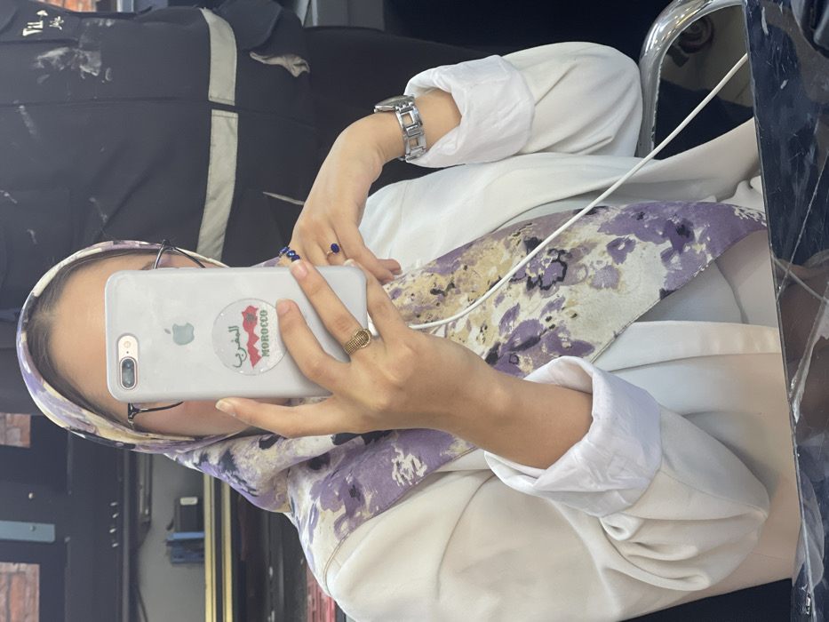 A person is depicted in an indoor commercial or workshop setting in Meknes, Morocco, engaged in the act of taking a self-portrait. The individual's face is predominantly obscured by a light gray iPhone held in both hands. Visible features include parts of the forehead and temples, along with dark-framed glasses. A headscarf, patterned with purple, beige, and white abstract or floral designs, covers the head. The person is wearing a light-colored blazer or jacket over a lighter garment, with the sleeves rolled back to reveal white shirt cuffs. The left hand bears a gold-colored, textured ring on the ring finger. The right wrist is adorned with a silver-colored metal link watch, and two blue rings are present on the middle and ring fingers of the right hand. A white earbud cable extends downwards from the individual. The iPhone case features a circular sticker displaying the Moroccan flag, alongside Arabic text reading "المغرب" and English text "MOROCCO". In the reflective background, a partial view of a second individual, wearing dark workwear with a prominent white horizontal stripe and exhibiting what appears to be paint smudges, is visible. To the far left background, industrial machinery or a large printer with dark and blue components is present. A vertical sign or text, partially legible as "Vil" or "Til," is discernible in the upper right background. The immediate foreground consists of a dark, reflective surface that shows smudges or texture.