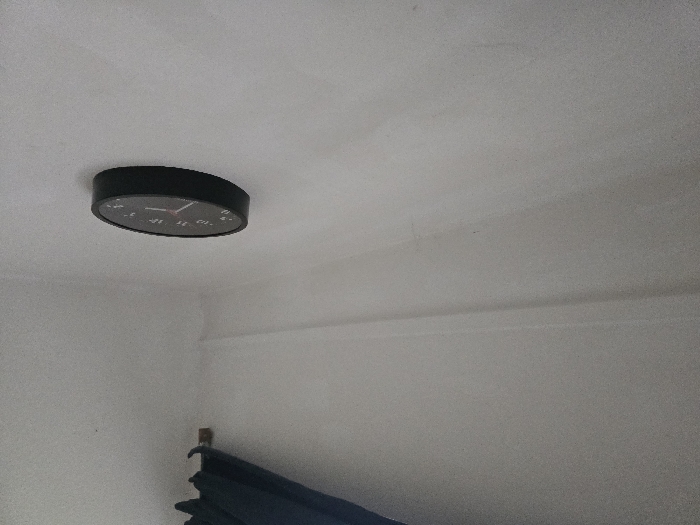 The image depicts an interior room with predominantly white walls. In the upper right quadrant, a circular wall clock is mounted, featuring a black frame, a black face with white Arabic numerals (1-12), and red hour and minute hands. To the upper left, a section of a dark blue or dark green gathered curtain is visible, suspended from a wooden curtain rod. The ceiling, also appearing white, is partially visible in the upper left. A subtle vertical seam or corner is discernible on the white wall towards the center of the image. No individuals, specific actions, or interactions are present. The specific location within the city of Dresden, Germany, cannot be determined from the visual evidence presented.