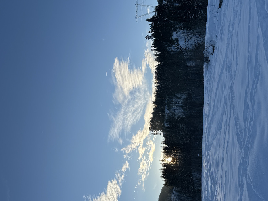 A winter landscape features a crisp blue sky punctuated by wispy white clouds. A dark line of trees contrasts with the bright snow-covered ground, marked with tracks. The sun shines through the trees, casting a golden glow. A tall power line structure is visible in the distance, adding a touch of human presence to the otherwise natural scene. The image is rotated to the side.