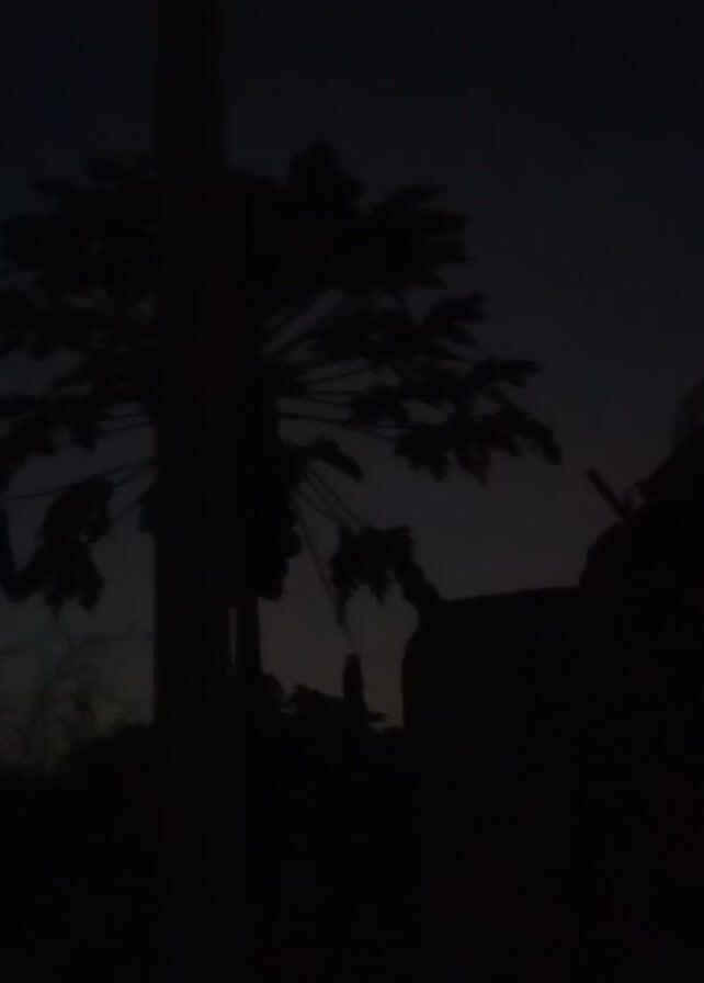 silhouette of a tall tree, with a few smaller trees beside it, against a dark sky. Some grass can be seen at the bottom of the frame. A utility pole is also visible. There is audio of music playing in the background.