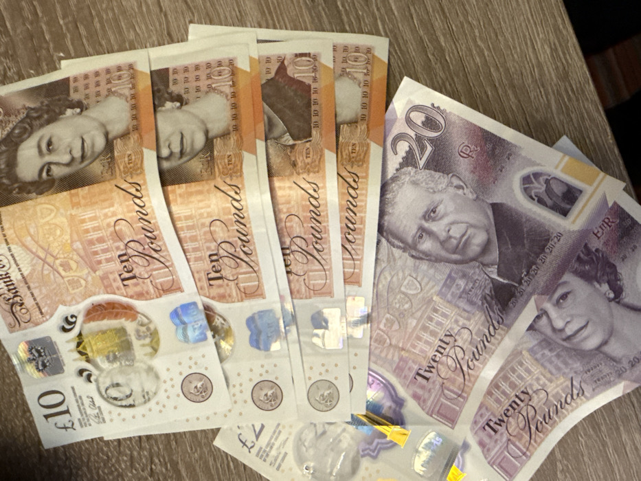 - "The image displays a collection of British polymer banknotes fanned out on a light brown, wood-grain textured surface" by FM-WqBWj1, licensed under CC BY 4.0