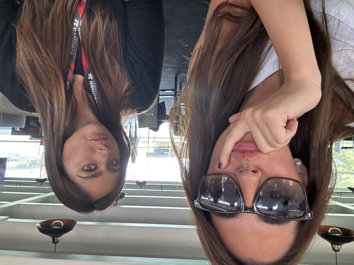 The image depicts two adult females seated indoors, observed from a slightly elevated perspective. The female in the foreground, left of frame, has long brown hair, wears oversized dark sunglasses, a white top, and a pearl earring on her visible left ear. Her right hand is raised, with the index finger resting beneath her lower lip, which is pursed in a "duck face" expression. Dark nail polish is visible on her right thumbnail. The second female, right of frame, also has long brown hair and wears a black long-sleeved top. A black and red lanyard, displaying "BANORTE" and a stylized logo, is visible around her neck. She faces forward with a neutral expression. The background features a white ceiling from which multiple black industrial-style pendant lights are suspended. Beyond the subjects, grey tables and chairs are arranged in a lounge or hospitality area. Through large windows or open partitions, an outdoor environment is visible, including trees, a paved area resembling a race track, and distant structures. The presence of the "BANORTE" branded lanyard and the track-side setting indicates the location as the Autódromo Hermanos Rodríguez in Mexico City, Mexico, likely during a major motorsports event such as the Formula 1 Grand Prix.