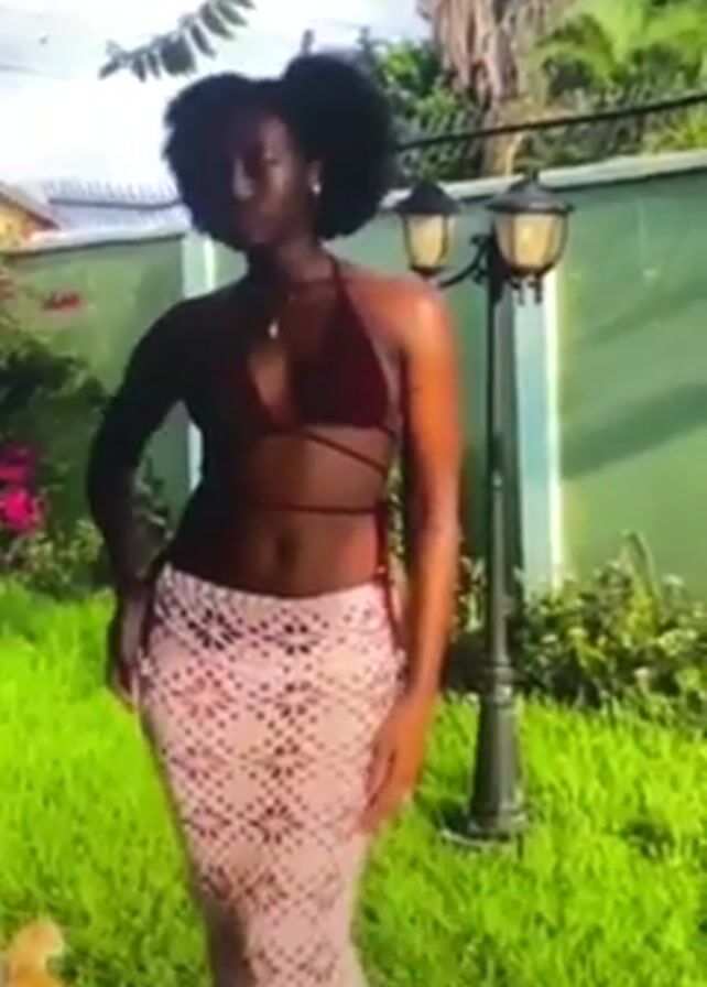 A young, dark-skinned woman in a bikini top and a crocheted skirt is standing in a grassy yard