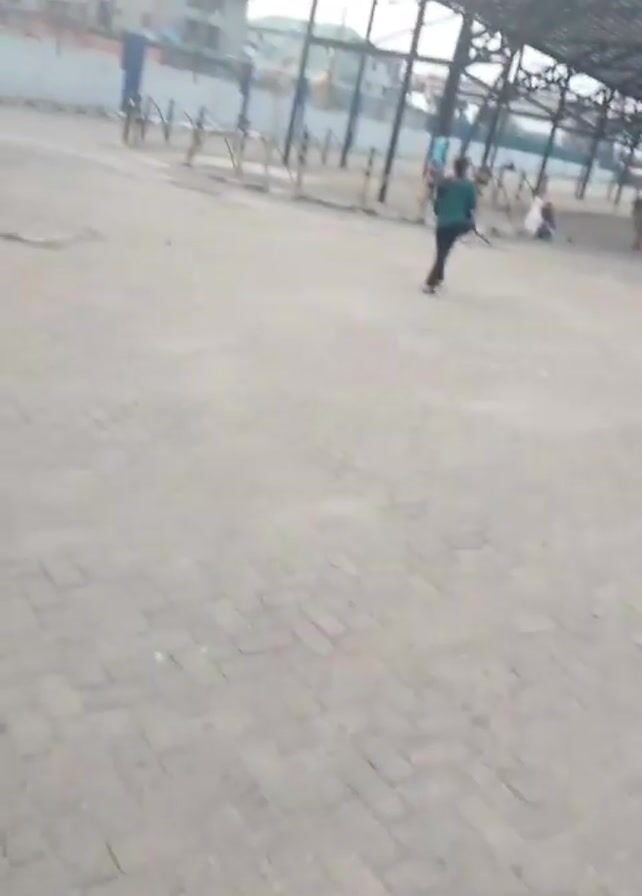 ground-level view of a public square or marketplace with a gray brick or cobblestone surface. Several people are walking around in different directions. Some are wearing casual clothes such as shorts and t-shirts, while others are wearing more formal attire. In the background, there's a large metal structure providing shade, likely a market or transportation hub covering. Buildings and an elevated road can be seen in the far background under an overcast sky. The video is somewhat shaky, suggesting it was filmed handheld while walking.
