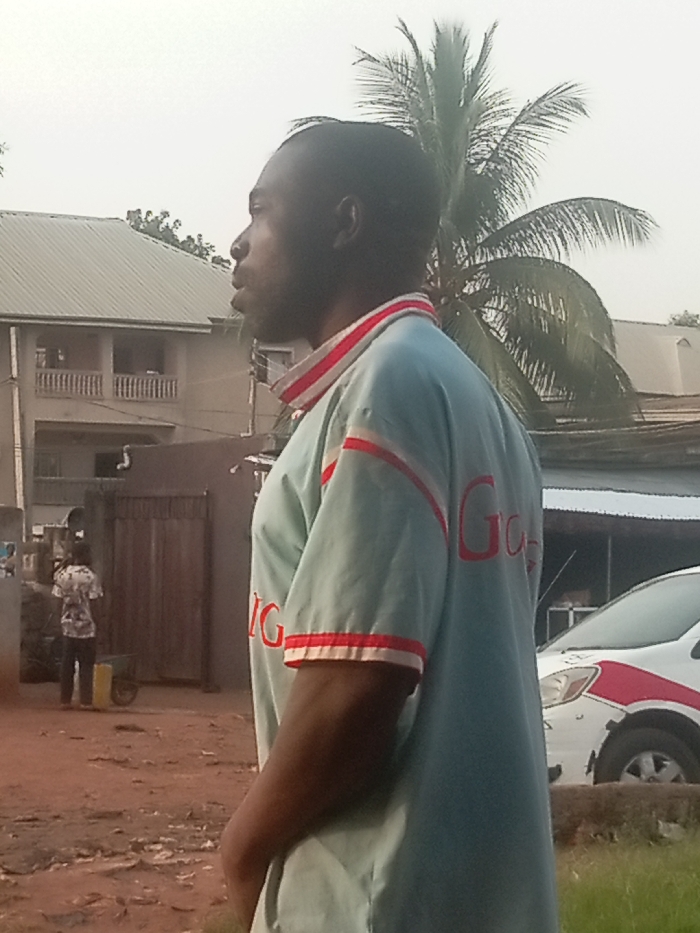 An adult male stands in profile, facing left, in an outdoor setting in Ogidi, Nigeria
